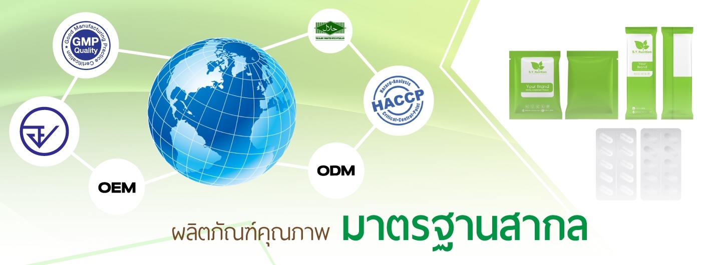 บริษัท เอส.วาย นิวทรีชั่น (ประเทศไทย) จำกัด รับผลิตอาหารเสริมหลากหลายชนิด เราเป็นหนึ่งในผู้นำด้านอุตสาหกรรม โรงงานผลิตอาหารเสริม ชั้นนำของเมืองไทย โดยให้บริการด้านต่างๆ ซึ่งเป็นโรงงานรับผลิตอาหารเสริม ที่ได้มาตรฐานสากล โดยควบคุมทุกกระบวนการทำงานด้วยทีมงานที่มีความเชี่ยวชาญเฉพาะ เราคือโรงงานรับผลิตอาหารเสริมชั้นนำ รับผลิตคอลลาเจน รับผลิตกลูต้า รับผลิตอาหารเสริมลดน้ำหนัก กาแฟลดน้ำหนัก ผลิตกาแฟผู้ชาย ผลิตอาหารเสริมผู้หญิง และผลิตอาหารเสริมผู้ชาย คุณภาพชั้นนำของเมืองไทย เรารับผลิตอาหารเสริมทุกชนิด แบบ One Stop Service พร้อมบริการขึ้นทะเบียนอย. และที่ปรึกษาส่วนตัวพิเศษที่ดูแลการสร้างแบรนด์อาหารเสริมแบบมืออาชีพ ด้วยเทคโนโลยีและเครื่องจักรที่ทันสมัย กับการคัดสรรส่วนผสมที่ดีที่สุดจากทั่วโลก เพื่อตอบสนองความพึงพอใจของลูกค้าที่ตรงกับความต้องการอย่างแท้จริง